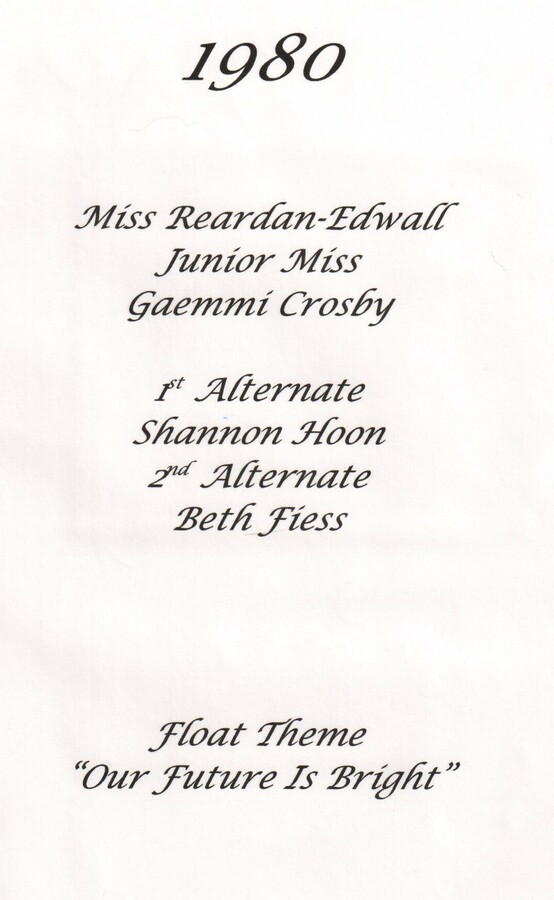 This page is from a scrapbook held by the Reardan Memorial Library about the Reardan Royalty. 1980 royalty 001