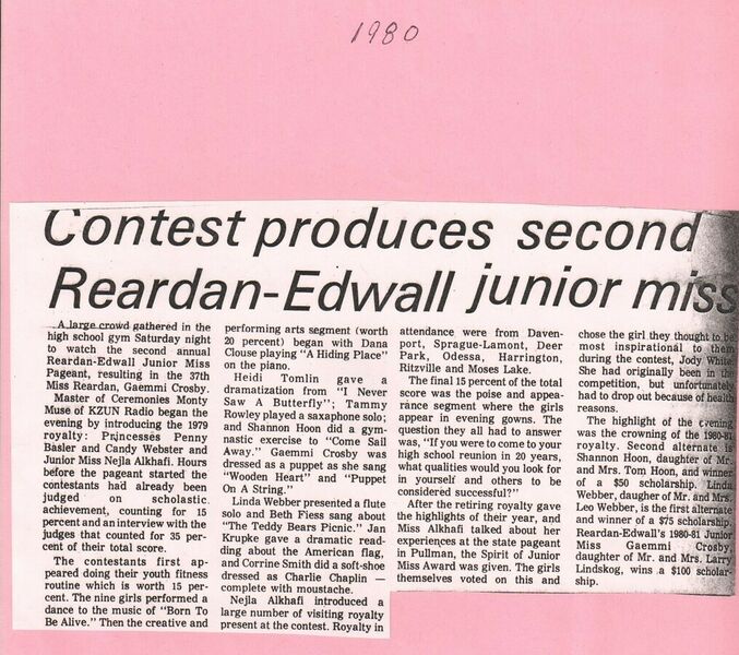 This page is from a scrapbook held by the Reardan Memorial Library about the Reardan Royalty. 1980 royalty 003