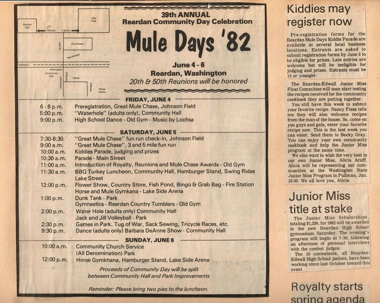 This page is from a scrapbook held by the Reardan Memorial Library about the Reardan Mule Days. 004