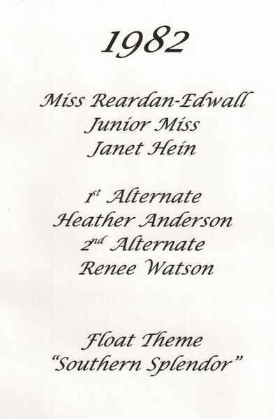 This page is from a scrapbook held by the Reardan Memorial Library about Reardan Royalty. 1982 royalty 000
