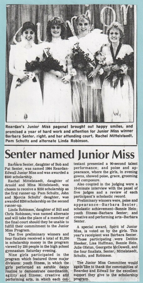 This page is from a scrapbook held by the Reardan Memorial Library about the Reardan Royalty. 1984 royalty 002