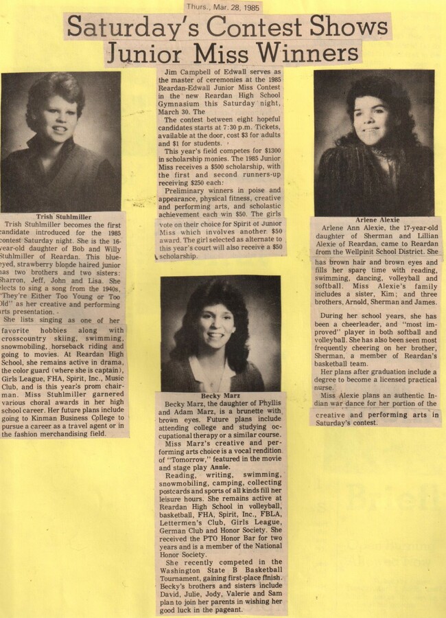 This page is from a scrapbook held by the Reardan Memorial Library about the Reardan Royalty. 1985 royalty 002