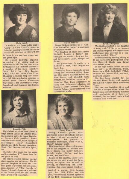 This page is from a scrapbook held by the Reardan Memorial Library about the Reardan Royalty. 1985 royalty 003