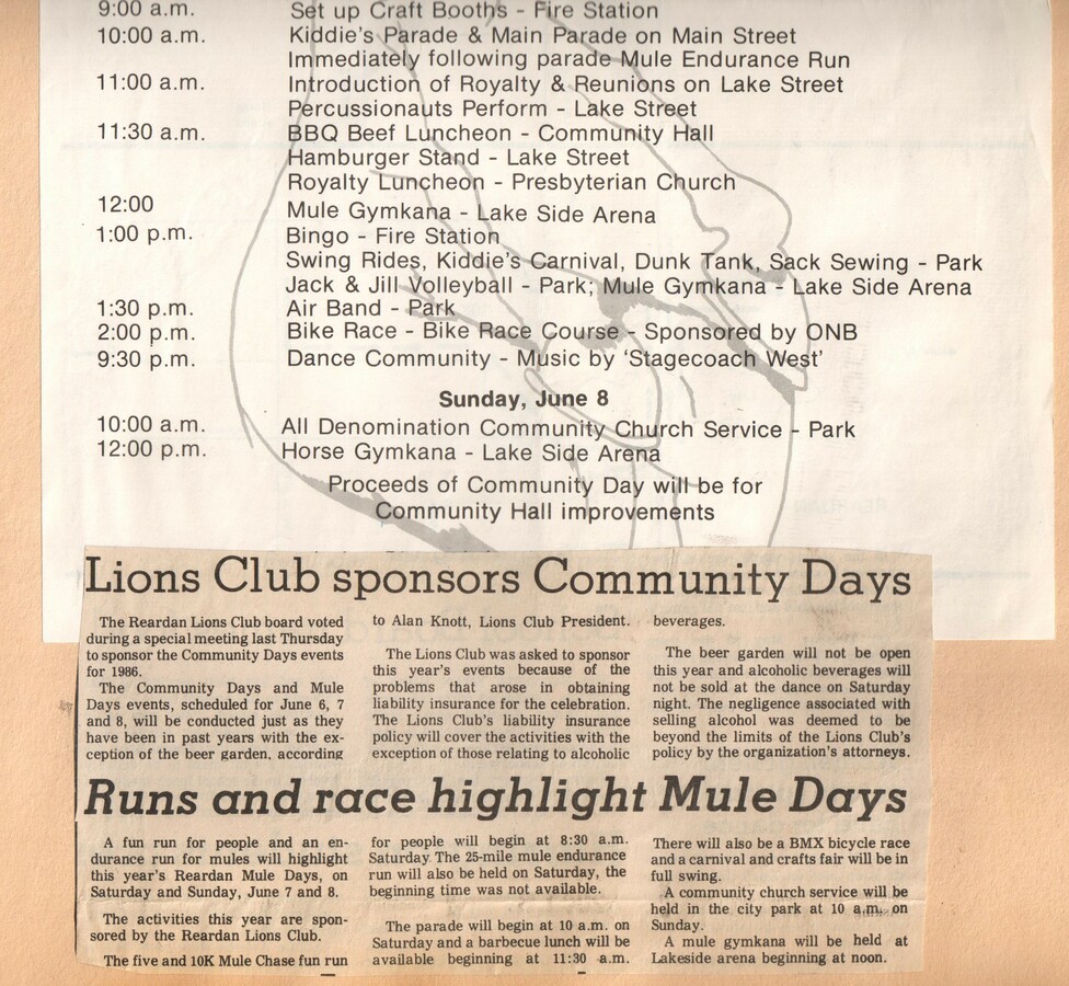 This page is from a scrapbook held by the Reardan Memorial Library about the Reardan Mule Days. 002
