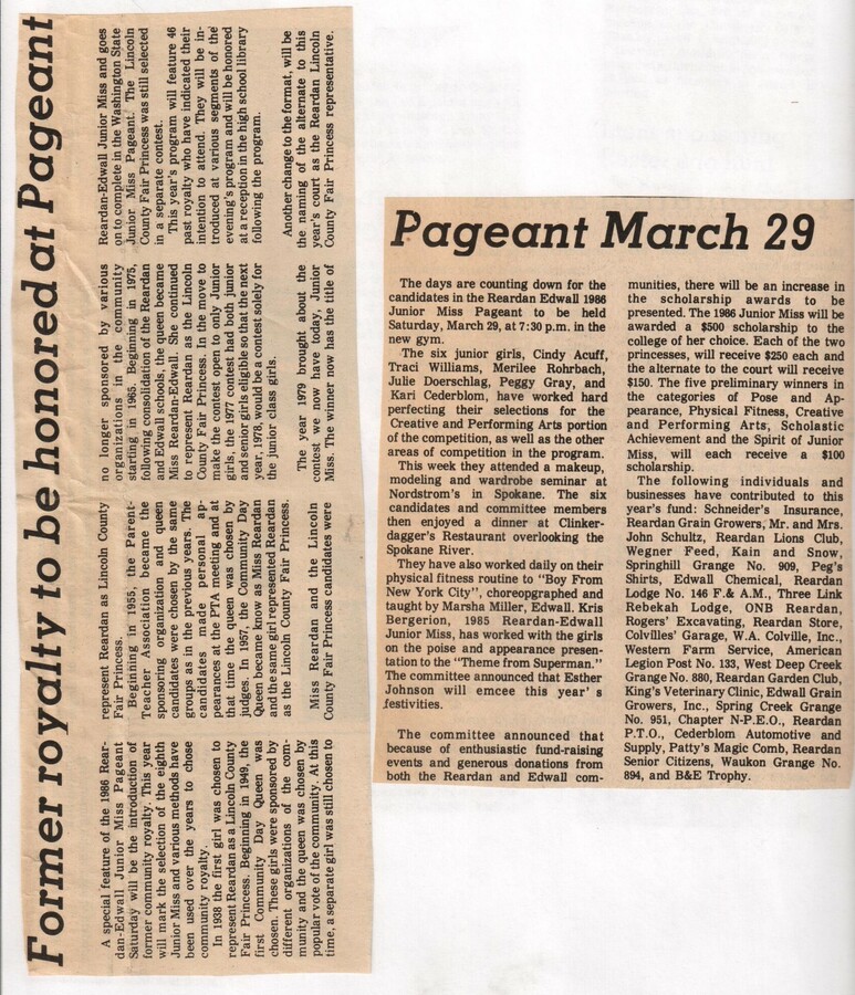 This page is from a scrapbook held by the Reardan Memorial Library about the Reardan Royalty. 1986 royalty 003