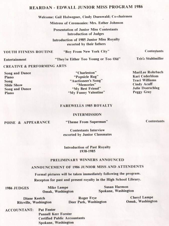 This page is from a scrapbook held by the Reardan Memorial Library about the Reardan Royalty. 1986 royalty 006