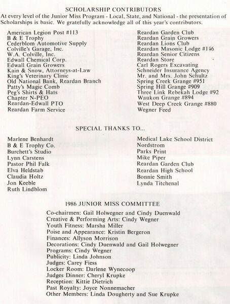 This page is from a scrapbook held by the Reardan Memorial Library about the Reardan Royalty. 1986 royalty 008