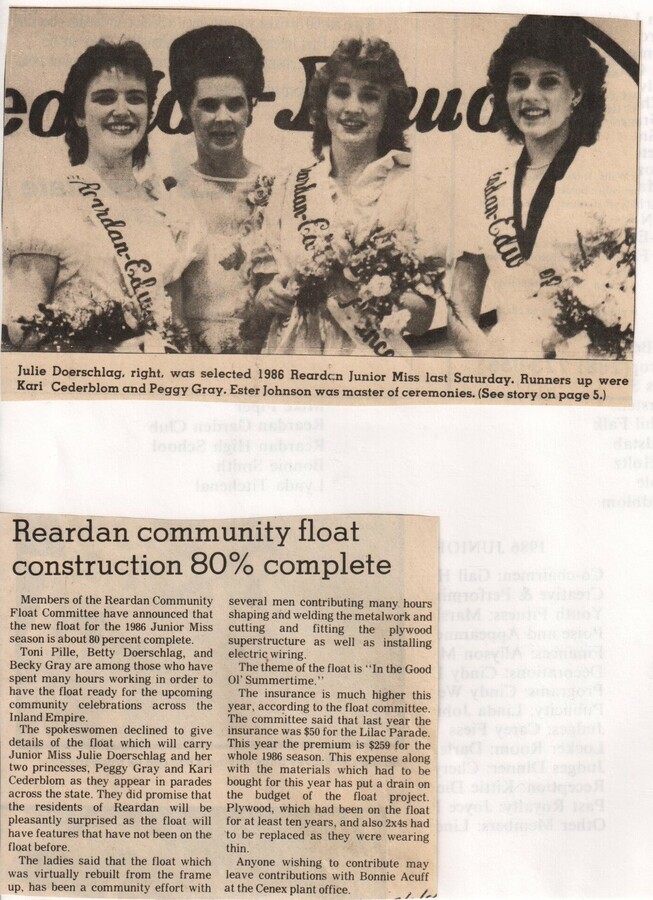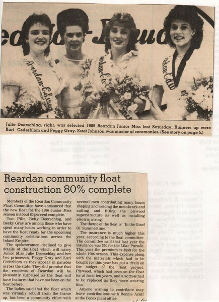 This page is from a scrapbook held by the Reardan Memorial Library about the Reardan Royalty. 1986 royalty 009