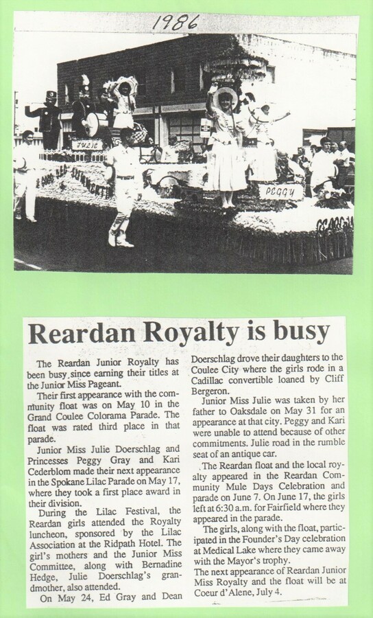 This page is from a scrapbook held by the Reardan Memorial Library about the Reardan Royalty. 1986 royalty 015