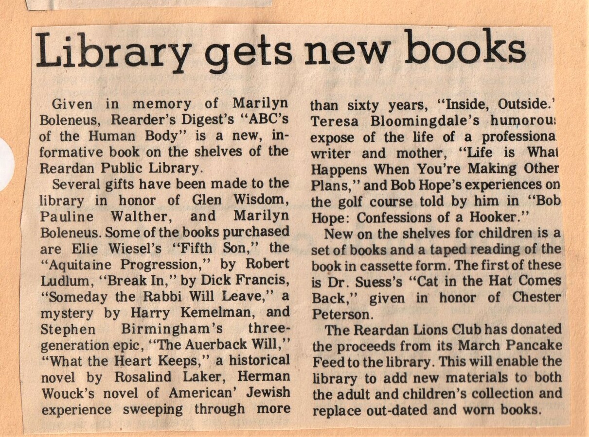 from Memorial Library scrapbook held by the Reardan Memorial Library.