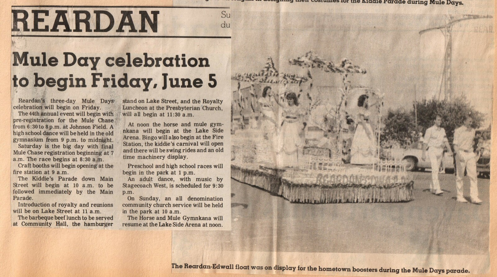 This page is from a scrapbook held by the Reardan Memorial Library about the Reardan Mule Days. 017
