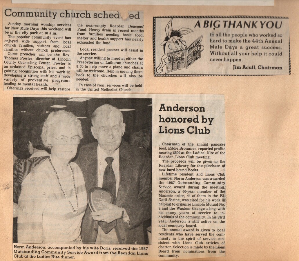 This page is from a scrapbook held by the Reardan Memorial Library about the Reardan Mule Days. 026