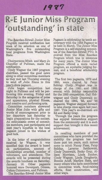 This page is from a scrapbook held by the Reardan Memorial Library about the Reardan Royalty. 1987 royalty 001