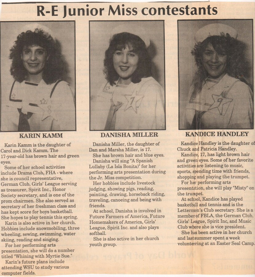 This page is from a scrapbook held by the Reardan Memorial Library about the Reardan Royalty. 1988 royalty 001