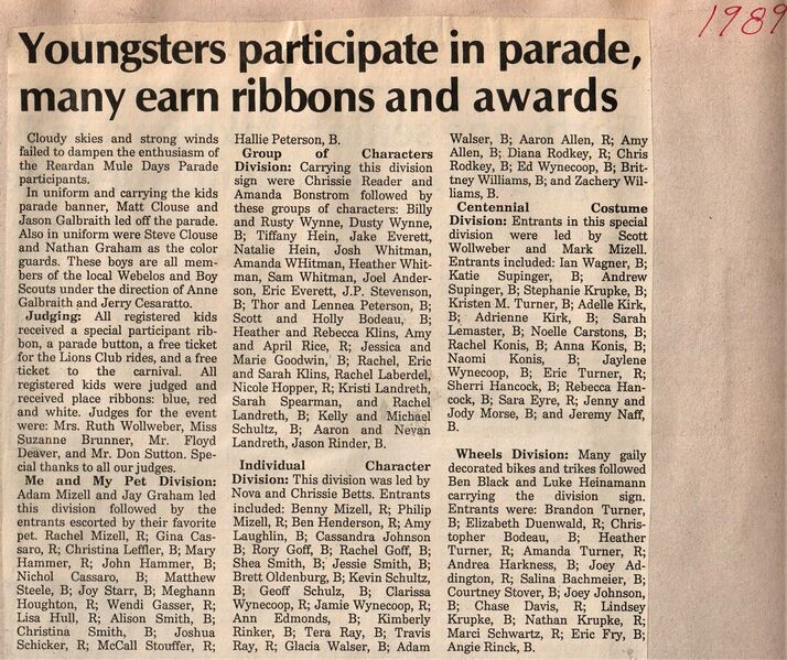 This page is from a scrapbook held by the Reardan Memorial Library about the Reardan Mule Days. 007