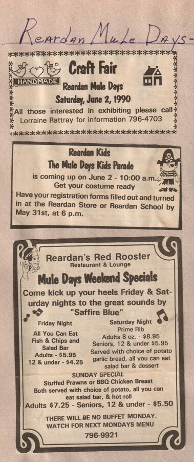 This page is from a scrapbook held by the Reardan Memorial Library about the Reardan Mule Days. 000