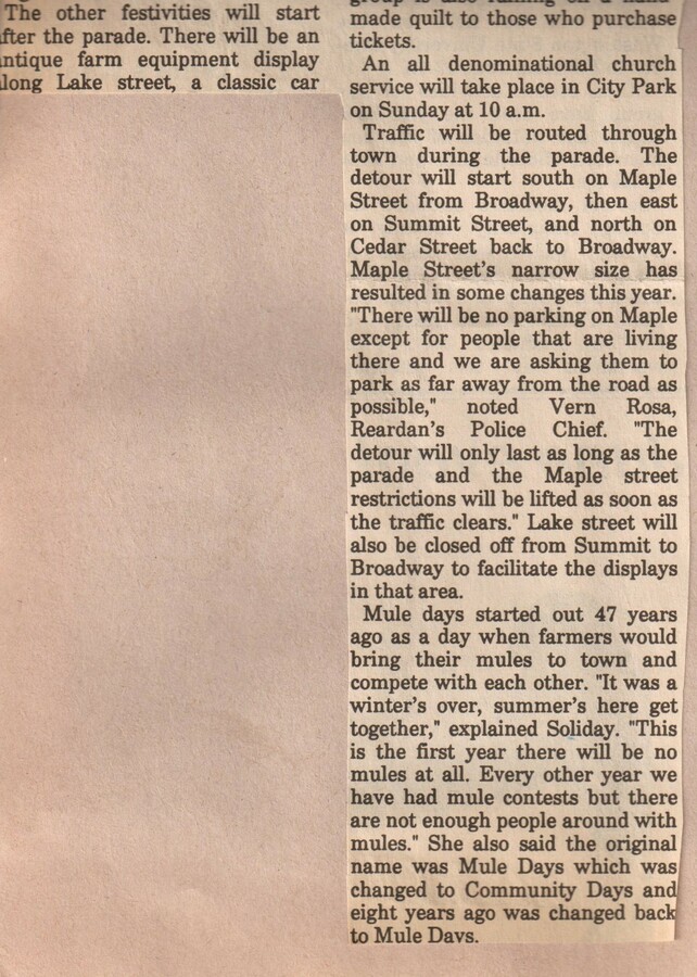 This page is from a scrapbook held by the Reardan Memorial Library about the Reardan Mule Days. 003