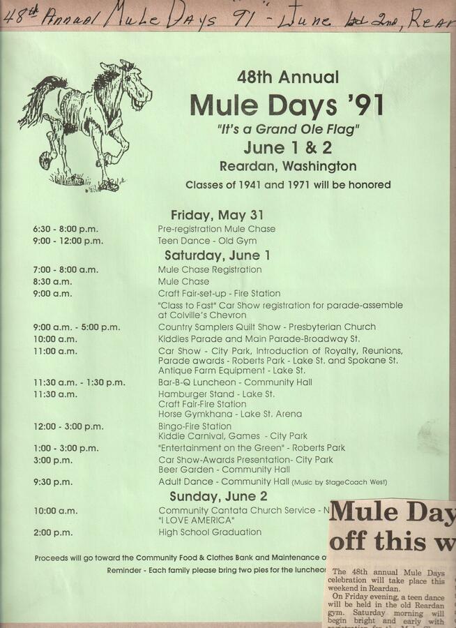 This page is from a scrapbook held by the Reardan Memorial Library about the Reardan Mule Days. 000
