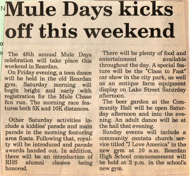 This page is from a scrapbook held by the Reardan Memorial Library about the Reardan Mule Days. 001