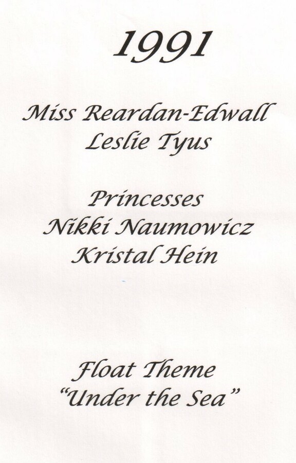 This page is from a scrapbook held by the Reardan Memorial Library about the Reardan Royalty. 1991 royalty 000