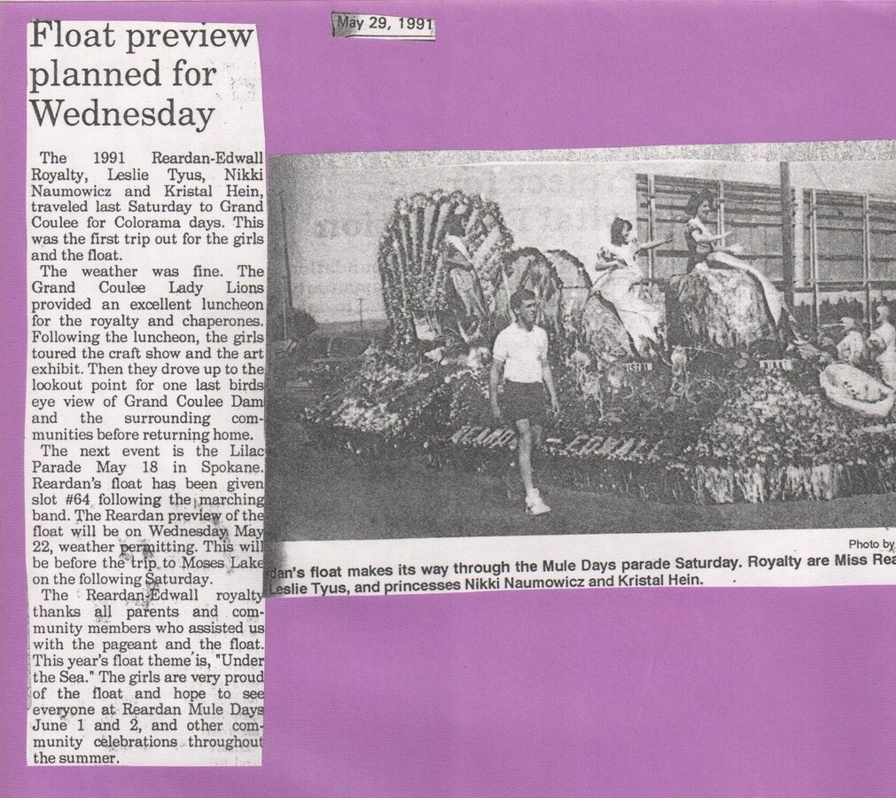 This page is from a scrapbook held by the Reardan Memorial Library about the Reardan Royalty. 1991 royalty 004