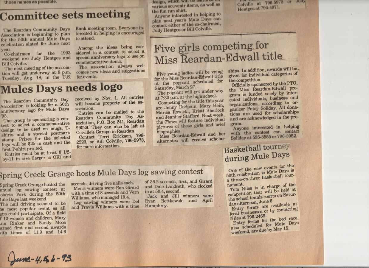 This page is from a scrapbook held by the Reardan Memorial Library about the Reardan Mule Days.