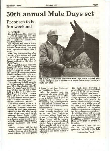 This page is from a scrapbook held by the Reardan Memorial Library about the Reardan Mule Days.