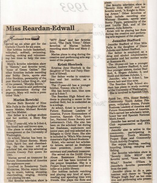 This page is from a scrapbook held by the Reardan Memorial Library about the Reardan Royalty. 1993 royalty 001