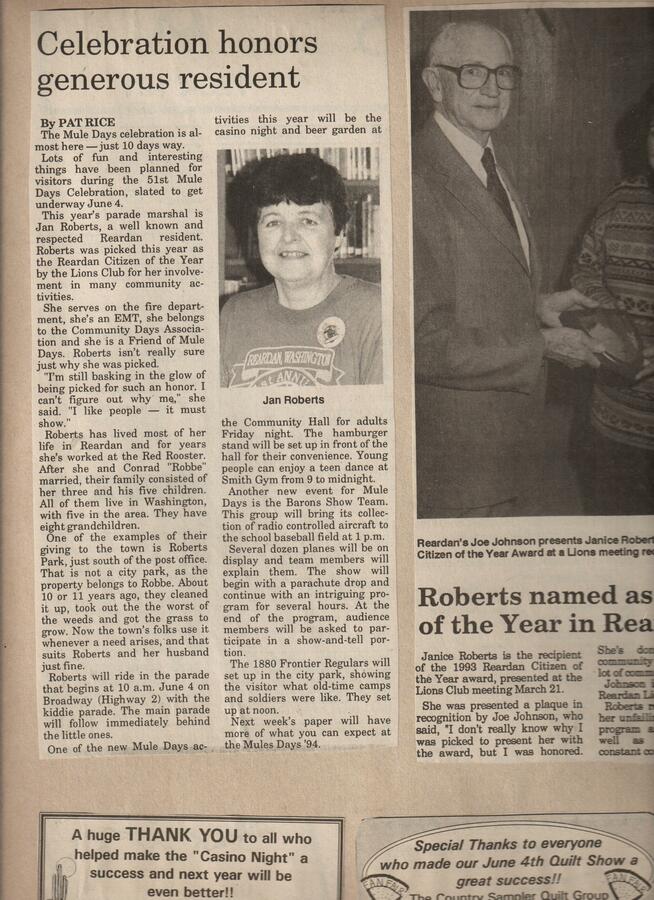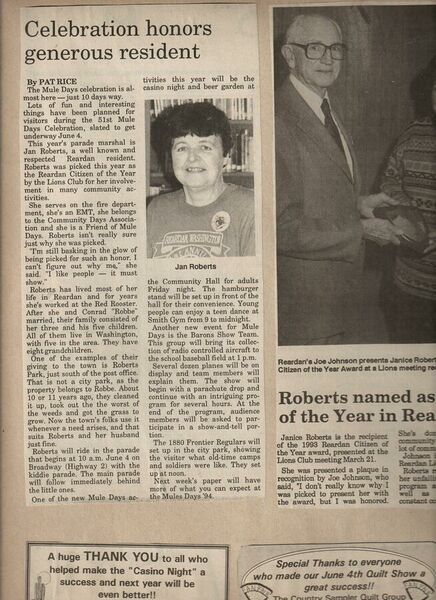 This page is from a scrapbook held by the Reardan Memorial Library about the Reardan Mule Days. 014