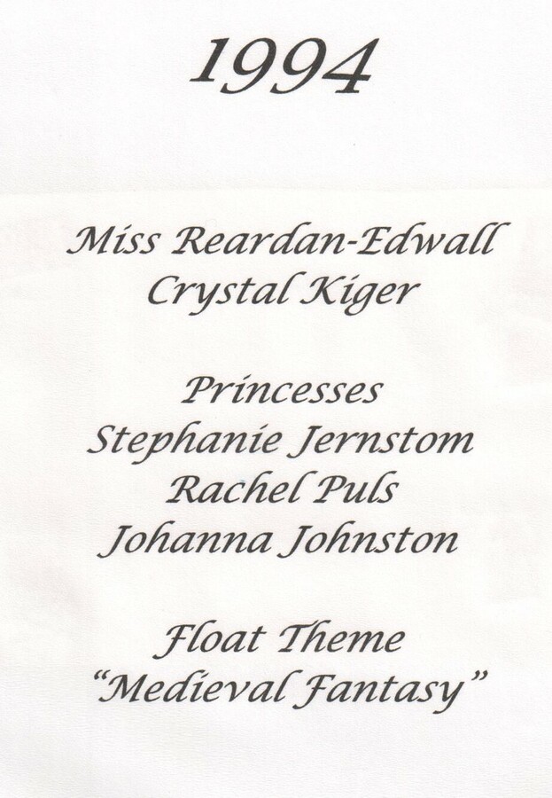This page is from a scrapbook held by the Reardan Memorial Library about the Reardan Royalty. 1994 royalty 000