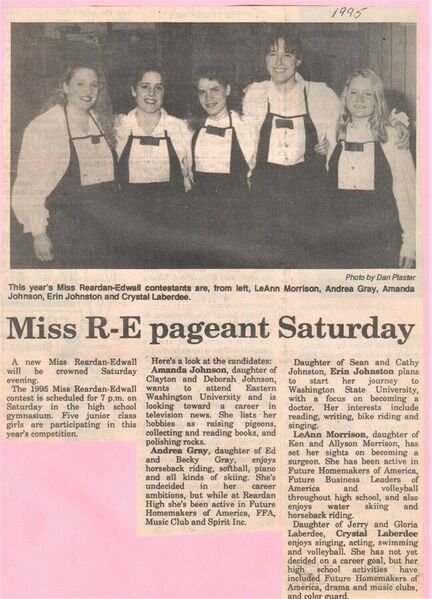 This page is from a scrapbook held by the Reardan Memorial Library about the Reardan Royalty. 1995 royalty 001