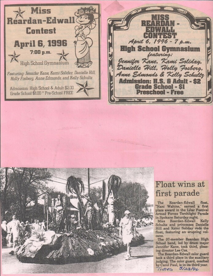 This page is from a scrapbook held by the Reardan Memorial Library about the Reardan Royalty. 1996 royalty 010