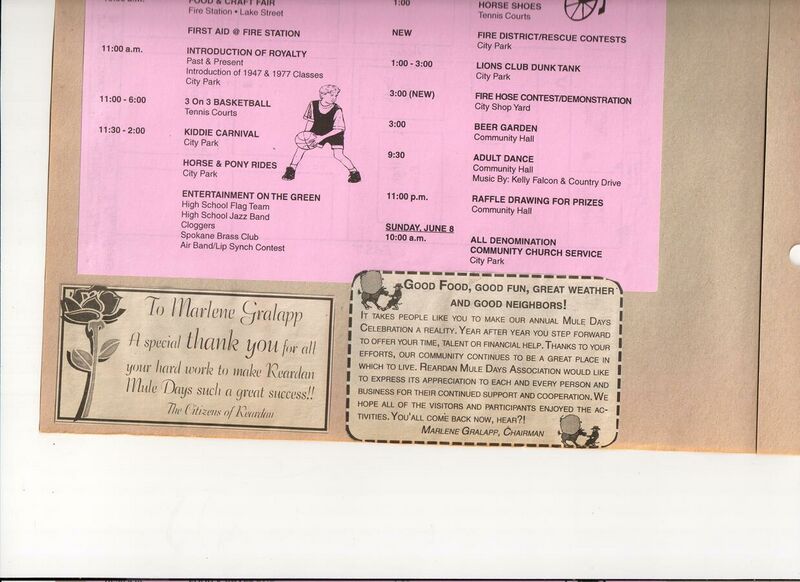 This page is from a scrapbook held by the Reardan Memorial Library about the Reardan Mule Days. 001