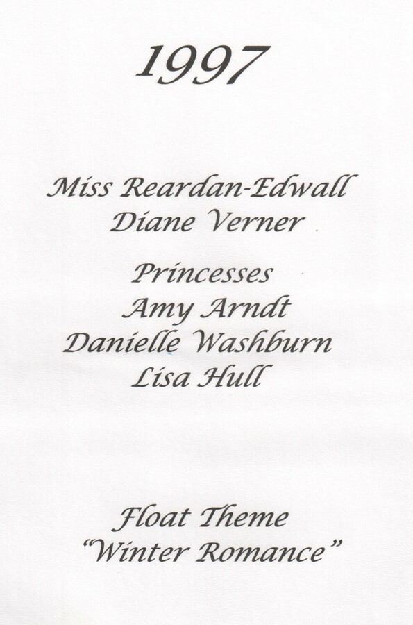 This page is from a scrapbook held by the Reardan Memorial Library about the Reardan Royalty. 1997 royalty 000