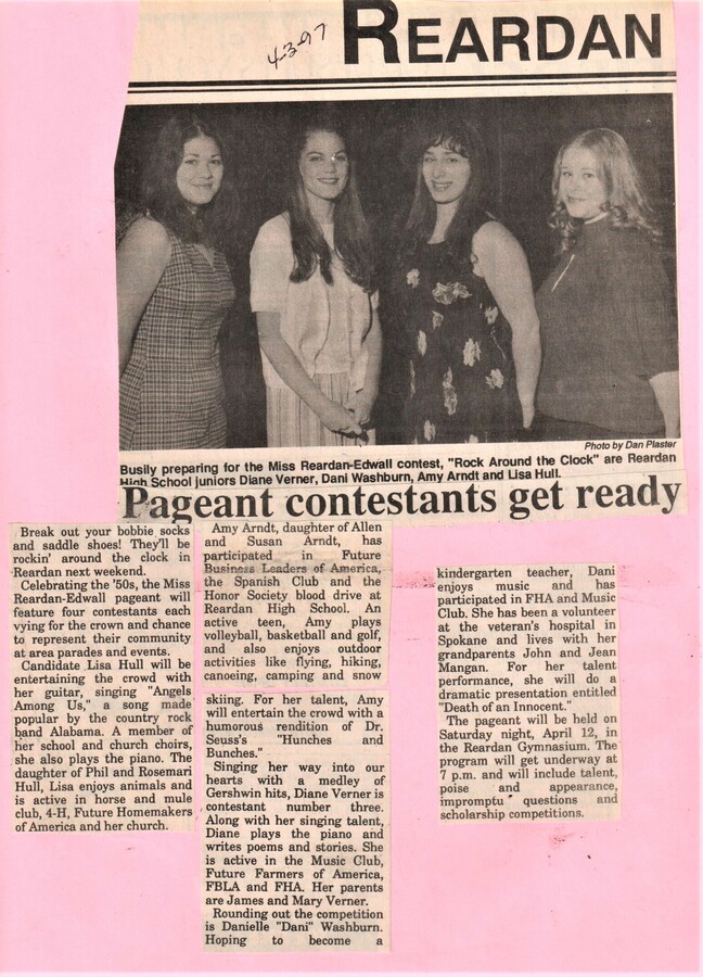 This page is from a scrapbook held by the Reardan Memorial Library about the Reardan Royalty. 1997 royalty 001