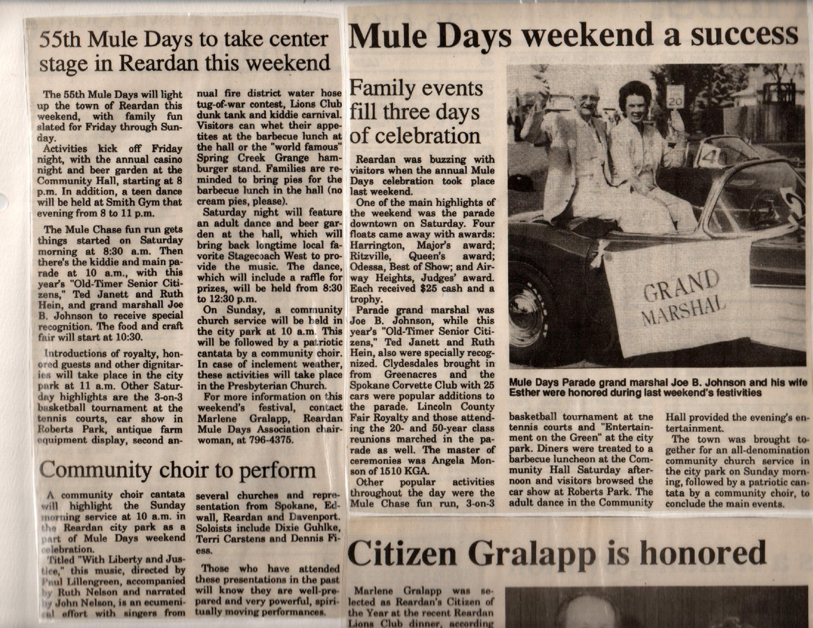 This page is from a scrapbook held by the Reardan Memorial Library about the Reardan Mule Days. 011