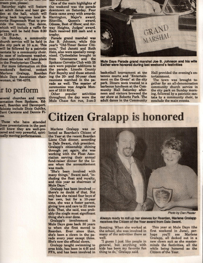 This page is from a scrapbook held by the Reardan Memorial Library about the Reardan Mule Days. 012