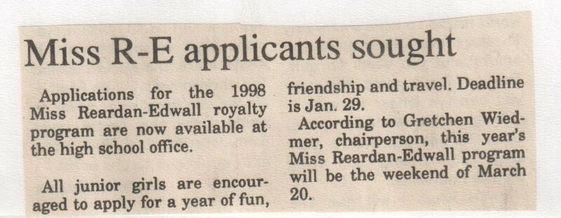 This page is from a scrapbook held by the Reardan Memorial Library about the Reardan Royalty. 1998 royalty 001