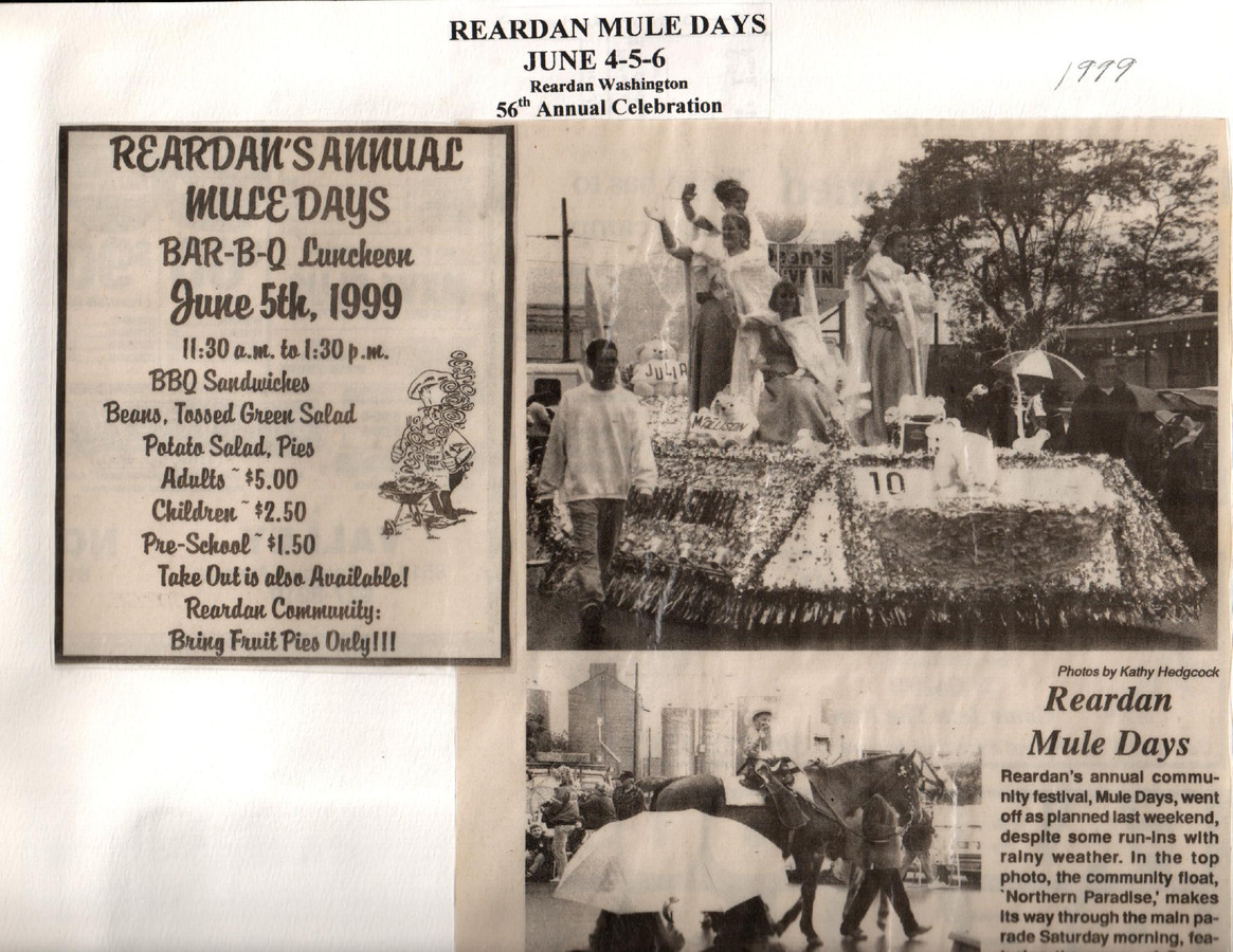 This page is from a scrapbook held by the Reardan Memorial Library about the Reardan Mule Days. 000