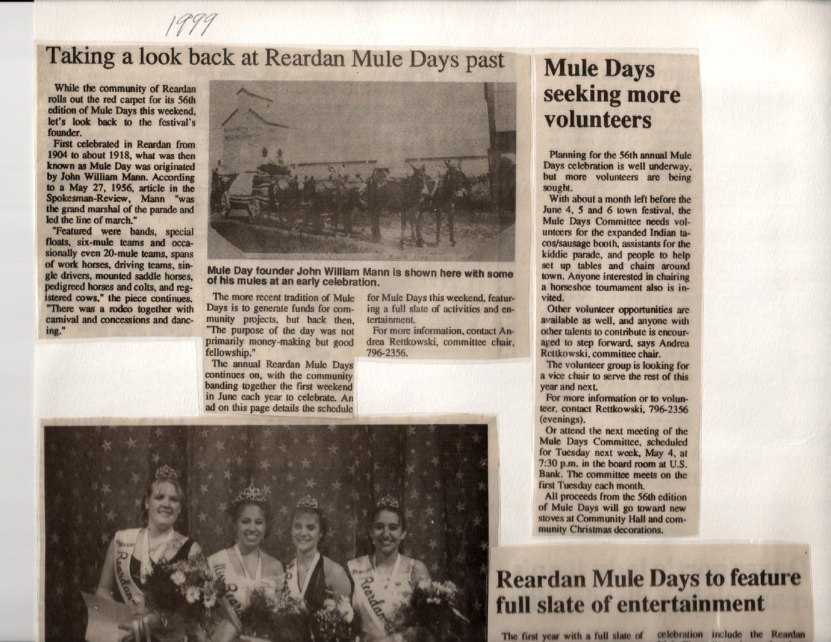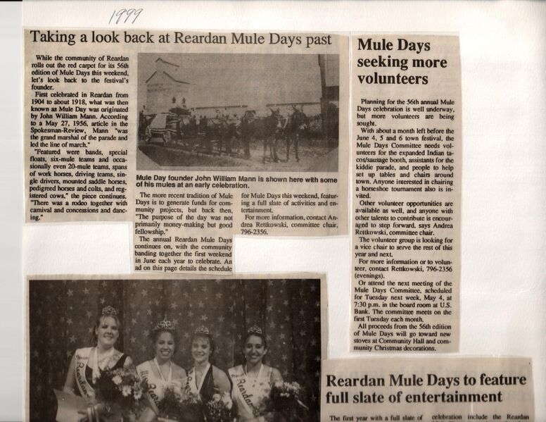 This page is from a scrapbook held by the Reardan Memorial Library about the Reardan Mule Days. 002