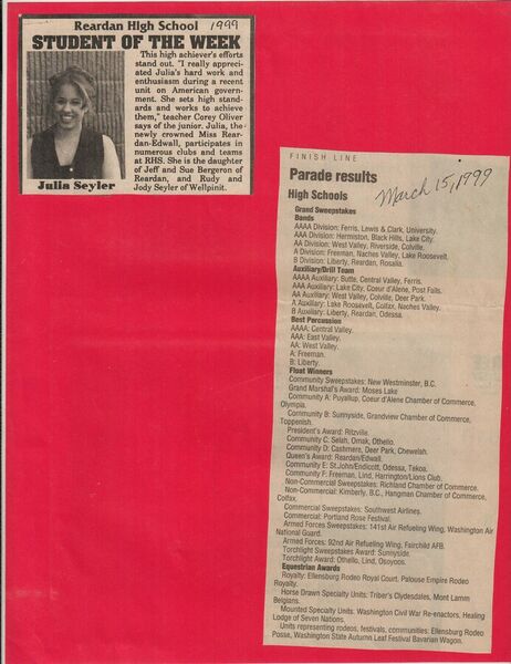 This page is from a scrapbook held by the Reardan Memorial Library about the Reardan Royalty. 1999 royalty 003