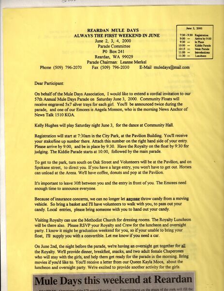 This page is from a scrapbook held by the Reardan Memorial Library about the Reardan Mule Days. 004