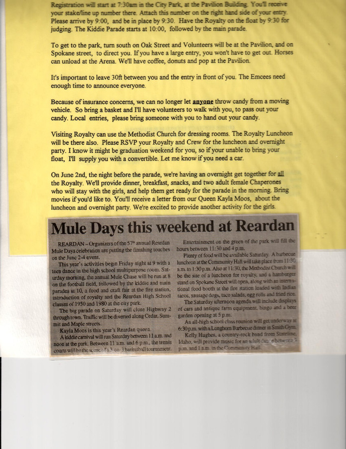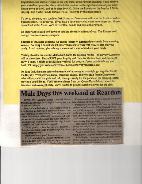 This page is from a scrapbook held by the Reardan Memorial Library about the Reardan Mule Days. 005