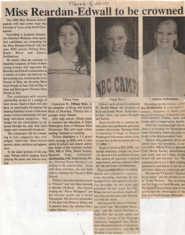 This page is from a scrapbook held by the Reardan Memorial Library about the Reardan Royalty. 2000 royalty 001