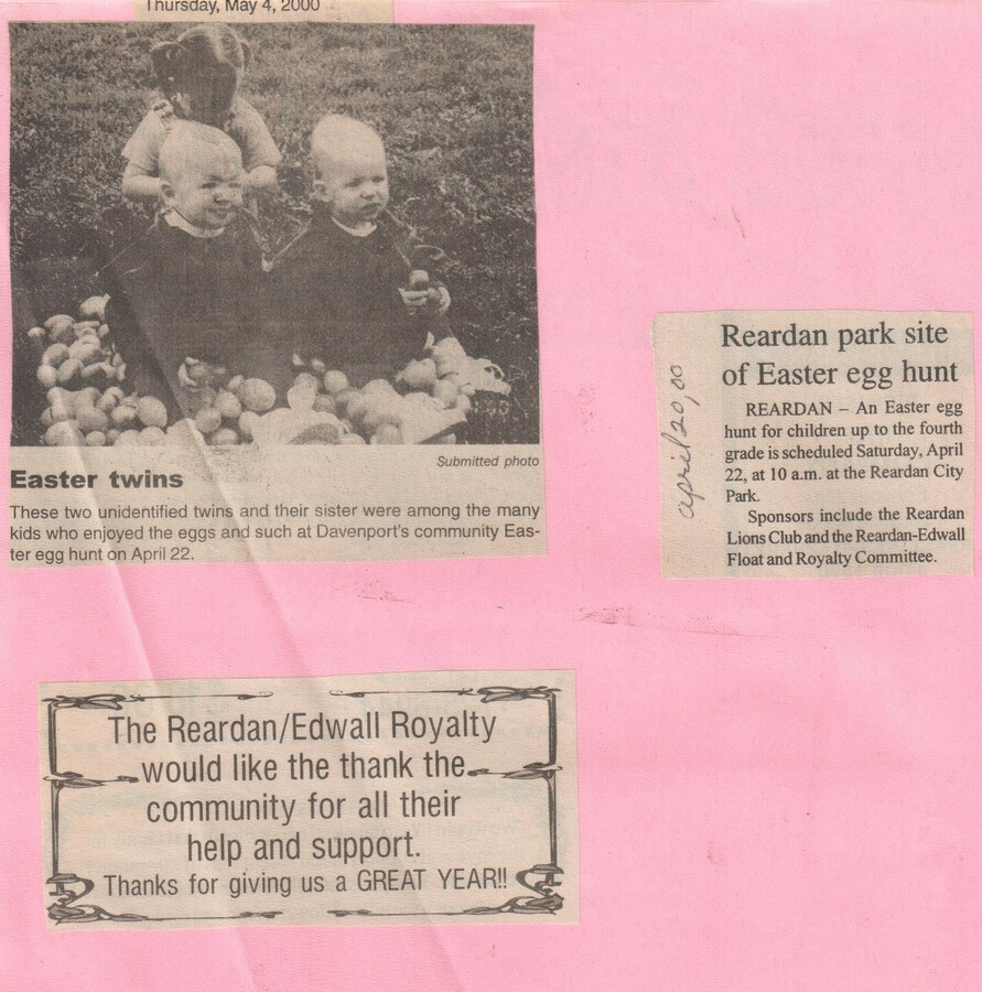 This page is from a scrapbook held by the Reardan Memorial Library about the Reardan Royalty. 2000 royalty 020