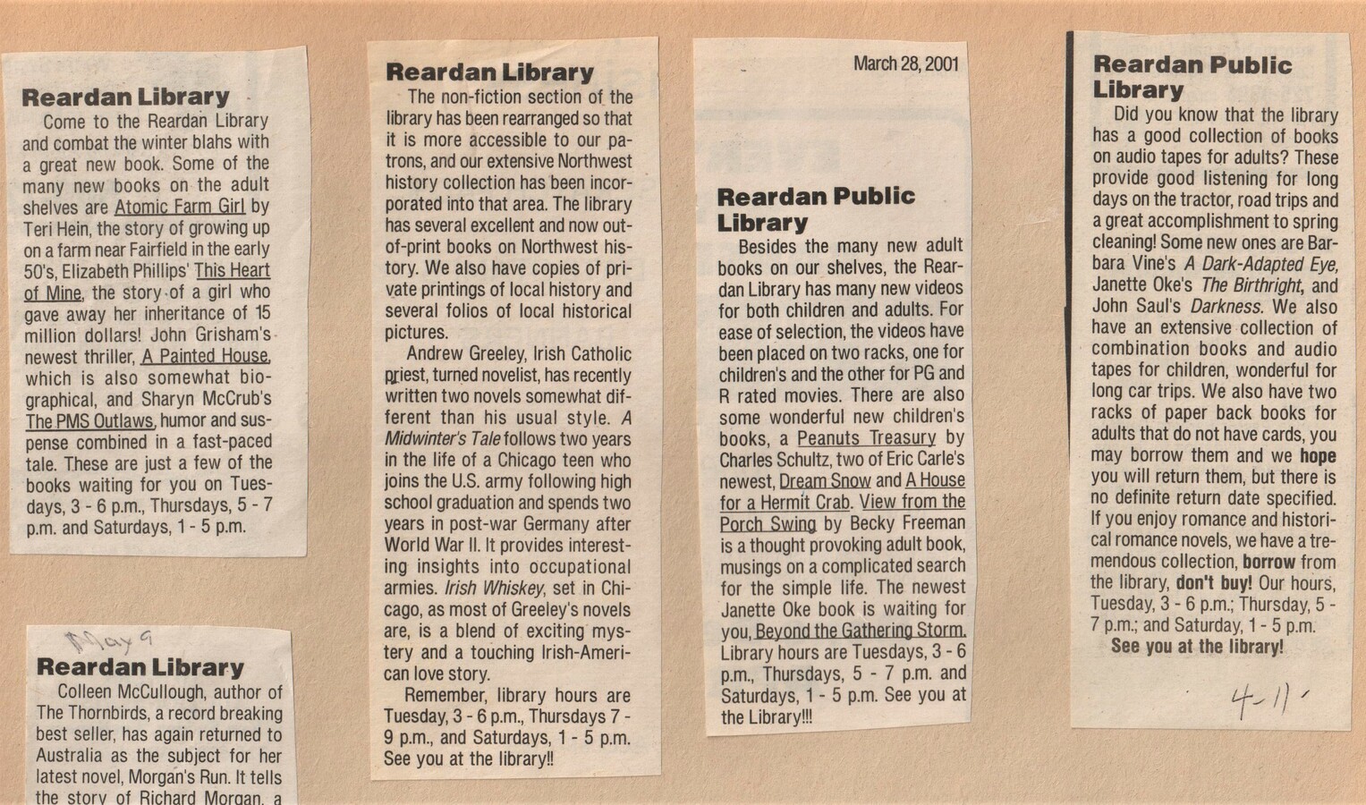 from Memorial Library scrapbook held by the Reardan Memorial Library.