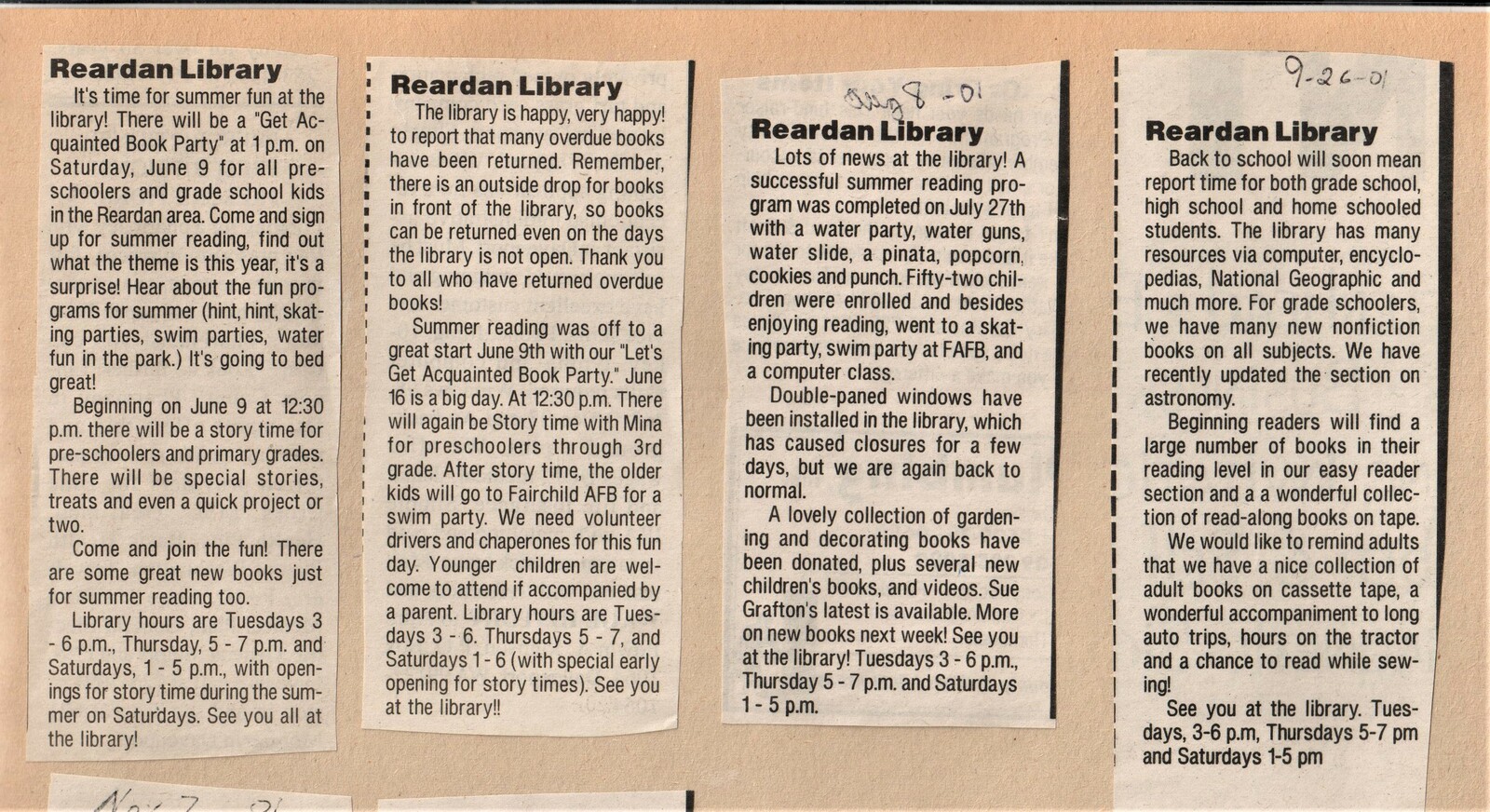 from Memorial Library scrapbook held by the Reardan Memorial Library.