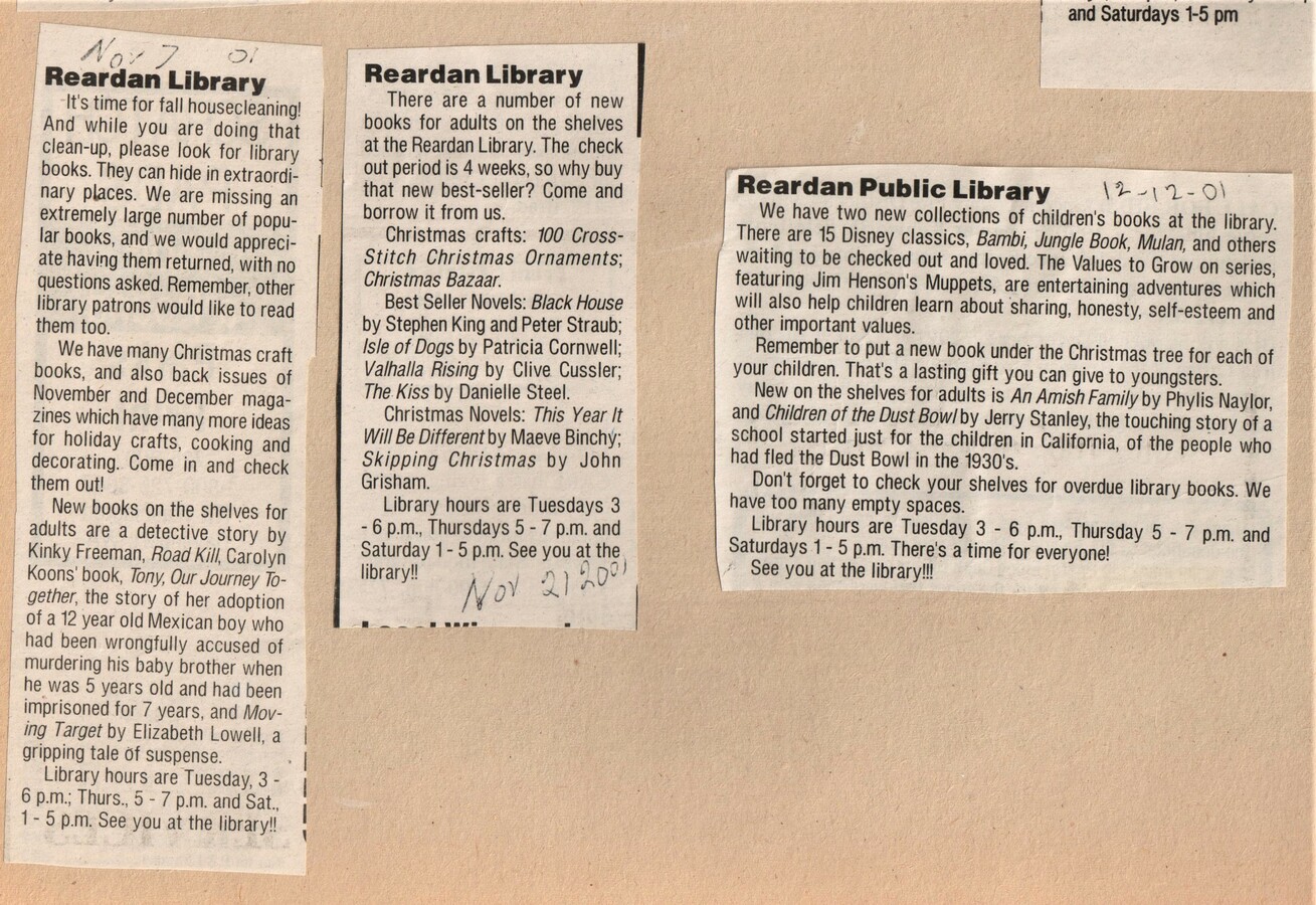 from Memorial Library scrapbook held by the Reardan Memorial Library.