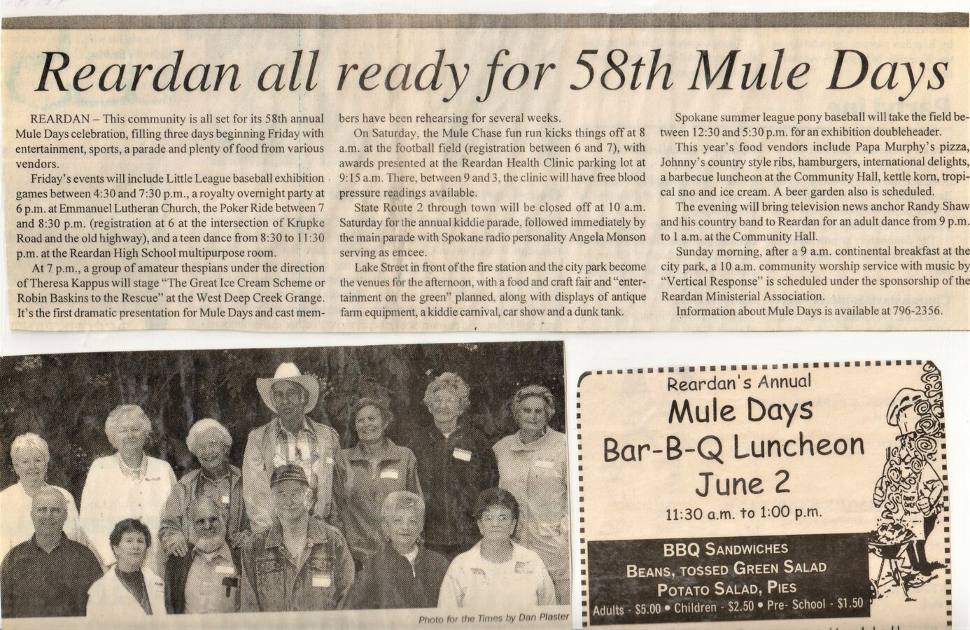 This page is from a scrapbook held by the Reardan Memorial Library about the Reardan Mule Days. 002