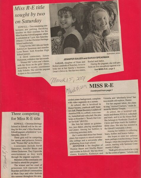 This page is from a scrapbook held by the Reardan Memorial Library about the Reardan Royalty. 2001 royalty 004